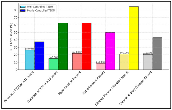 Table 7 reveals critical insights into ICU admissions among different subgroups, based on the duration of type 2 diabetes mellitus (T2DM) and the presence of comorbid conditions. Notably, the subgroup of patients with poorly controlled diabetes and a longer duration of T2DM (≥10 years) showed a substantially higher rate of ICU admission (62.5%) compared to those with well-controlled diabetes (15.0%), indicating a significant p-value of 0.005. Similar trends were observed in patients with hypertension and chronic kidney disease, where poorly controlled diabetic patients exhibited markedly higher ICU admissions, something which was especially striking regarding those with chronic kidney disease (84.6% vs. 21.1%, p = 0.001), as presented in Figure 1.
