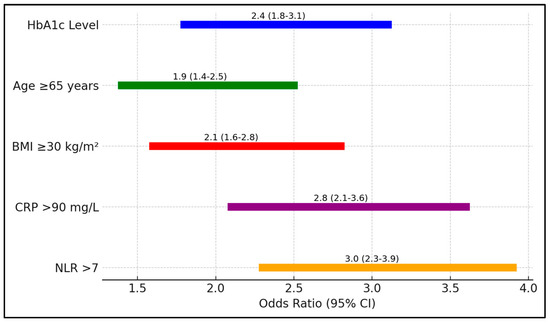 In Table 8, the analysis quantifies the risk associated with various factors for ICU admission among patients with COVID 9 and T2DM. Elevated HbA1c levels posed a 2.4-fold increased risk (95% CI 1.8–3.1, p = 0.001), underscoring the critical influence of glycemic control on disease severity. Additional factors such as age ≥ 65 years and a BMI ≥ 30 kg/m2 also significantly increased the risk of ICU admission, with odds ratios of 1.9 and 2.1, respectively (Figure 2).