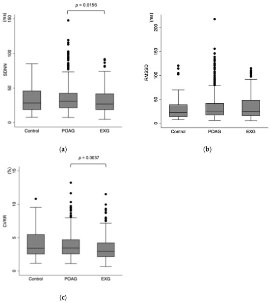 Association between time-domain parameters and glaucoma. (a) SDNN in control, POAG, and EXG were 33.6 ± 18.7 ms, 35.3 ± 20.1 ms, and 32.0 ± 18.5 ms, respectively (Kruskal–Wallis test, p = 0.051). In terms of SDNN, a Mann–Whitney test with Bonferroni correction showed a significant difference between POAG and EXG (p = 0.0156). (b) RMSSD in control, POAG, and EXG were 30.6 ± 25.2 ms, 35.1 ± 28.5 ms, and 34.7 ± 24.5 ms, respectively (Kruskal–Wallis test, p = 0.132). (c) CVAA in control, POAG, and EXG were 4.04 ± 2.08%, 3.86 ± 1.87%, and 3.57 ± 2.02%, respectively (Kruskal–Wallis test, p = 0.010). In terms of CVRR, a Mann–Whitney test with Bonferroni correction showed a significant difference between POAG and EXG (p = 0.0037). Post hoc comparisons were also performed using the Mann–Whitney U test with Bonferroni correction (SDNN: Control vs. POAG, p = 0.3656; Control vs. EXG, p = 0.4918; RMSSD: Control vs. POAG, p = 0.0453; Control vs. EXG, p = 0.1056; CVRR: Control vs. POAG, p = 0.6851; Control vs. EXG, p = 0.1056). Bonferroni-corrected significance threshold was set at p < 0.0167. POAG = primary open-angle glaucoma; EXG = exfoliation glaucoma; SDNN = the standard deviation of normal-to-normal intervals; RMSSD = the square root of the mean of the sum of the squared differences between adjacent normal-to-normal intervals; CVRR = the coefficient of variation of R-R intervals.