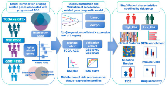 Cellular senescence, marked by an irreversible cessation of cell division, was initially regarded as a natural defense against tumor growth. However, recent studies have shown that senescent tumor cells can persist, releasing a collection of factors known as the senescence-associated secretory phenotype (SASP), which primarily comprises proinflammatory chemokines and cytokines [12,13,14]. These SASP factors are increasingly recognized as a double-edged sword in cancer, capable of both promoting anti-tumor immune cell infiltration and driving tumor progression by influencing the behavior of nearby cells [15,16]. As a result, some researchers suggest the following novel strategy: first induce tumor cell senescence with a senescence-inducing agent, followed by the targeted elimination of these senescent cells using senolytic modalities [17]. Recent animal studies on ACC have shown that genetic mutations can trigger cellular senescence, contributing to adrenal cancer development in older mice [18,19]. Further research has demonstrated an upregulation of the aging biomarkers p21 and p53 in ACC, along with elevated Ki-67 expression, when compared to adrenocortical adenomas (ACA) [20,21]. However, the exact role of senescence in ACC remains unclear, as it could function either as a protective or a risk factor. Therefore, we hypothesize that gene expression related to senescence may provide a foundation for developing a model to predict ACC progression and guide treatment strategies. In this study, we developed a four-gene signature model based on senescence-associated genes to predict outcomes in ACC. Using data from the TCGA-ACC and GEO databases, we assessed the correlation between these genes and ACC prognosis. Furthermore, we explored how the signature relates to clinical features, immune cell infiltration, immune therapy responses, and drug sensitivity in ACC patients. Our findings provide insights into the association between these genes and the prognosis of ACC, which may inform future studies on their potential role in cellular senescence and therapeutic strategies.