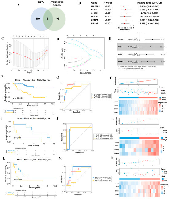 Construction and Validation of the Prognostic Model. (A) The Venn diagram highlights six differential expression genes associated with prognosis. (B) The forest plot displays the hazard ratios of the six genes in relation to overall survival (OS). (C) LASSO regression analysis of OS-related genes. (D) The cross-validation results for tuning parameter selection in the LASSO regression model. (E) The forest plot illustrating the multivariate Cox regression analysis of the four genes included in the final prognostic model. Kaplan–Meier survival curves, time-dependent ROC curves, distribution of risk scores, survival status, and expression profiles of the four signature genes for the TCGA-ACC dataset (F–H). Kaplan–Meier survival curves, time-dependent ROC curves, distribution of risk scores, survival status, and expression profiles of the four signature genes for the GSE19750 dataset (I–K). Kaplan–Meier survival curves, time-dependent ROC curves, distribution of risk scores, survival status, and expression profiles of the four signature genes for the GSE10927 (L–N).