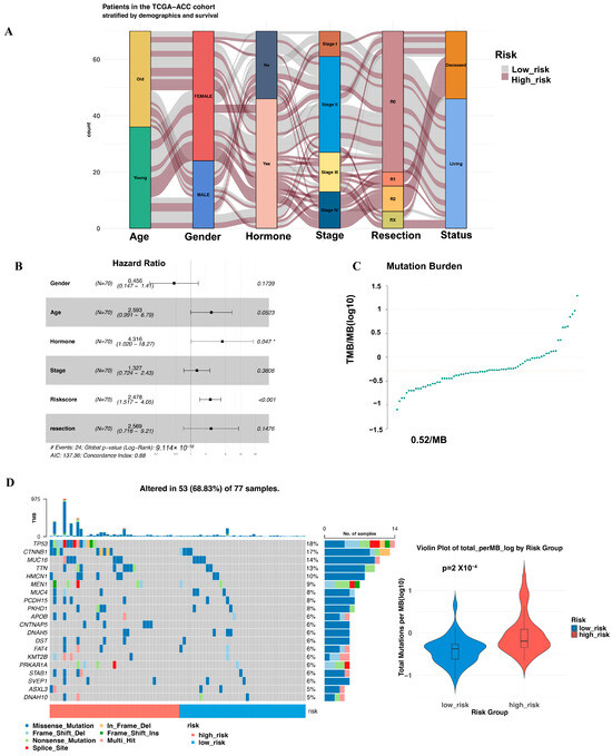 Clinical features and mutation profile of ACC patients in the two risk groups. (A) The Sankey diagram shows clinical traits across the two risk groups. (B) The forest plot depicts the results of a multivariate Cox regression analysis, highlighting the association between clinical characteristics and risk score with overall survival.* p < 0.05 (C) The mutation burden of TCGA-ACC dataset. (D) The waterfall plot visualizes the characteristics of the top 20 mutation types in the two groups with violin plot of mutation burden between the two cohorts.