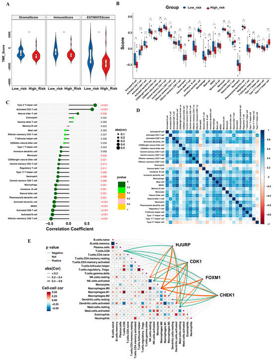 ESTIMATE analysis revealed a lower immune score in the high-risk group, suggesting lower immune cell infiltration in the high-risk group (Figure 5A). Consistently, ssGSEA confirmed significantly lower scores for activated CD8 T cells, effector memory CD8 T cells, and γδ T cells in the high-risk group. In contrast, type 2 T helper cells and activated CD4 T cells were more abundant in the high-risk group (Figure 5B). In line with these findings, a detailed correlation analysis between the risk score and immune cells is presented in Figure 5C, showing that most immune cell populations exhibited negative correlations with the risk score. The 28 tumor-infiltrating immune cell types displayed weak to moderate correlations (Figure 5D). Moreover, immune cell proportion composition analysis using CIBERSORT showed CD8 T cells, activated NK cells, and resting mast cells were all negatively correlated with genes in our model (HJURP, CDK1, FOXM1, CHEK1), while macrophages M0, activated dendritic cells, resting NK cells and activated dentritic cells were positively correlated (Figure 5E). The correlations between these four genes and immune cell scores, as analyzed by ssGSEA, are provided in Supplementary Figure S7.