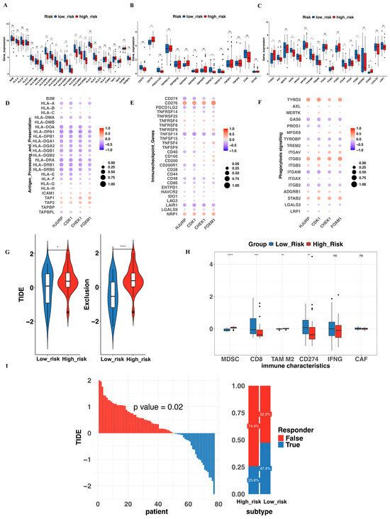 Analysis of immune function-related genes and model-based immunotherapy response prediction. (A) The box plot illustrates the expression of genes involved in antigen processing and presentation between the two risk groups. (B) Gene expression of immune checkpoint genes in the two risk cohorts. (C) Expression of phagocytosis signaling-related genes across high- and low-risk patients. (D–F) The correlation of HJURP, CDK1, FOXM1, and CHEK1 with genes involved in antigen processing and presentation, immune checkpoint regulation, and phagocytosis signaling. (G) The TIDE scores and immune exclusion scores between the two groups. (H) The immune characteristics of the tumor microenvironment (TME) in the two groups. (I) The immunotherapy response prediction for the two groups. * p < 0.05, ** p < 0.01, *** p < 0.001, **** p < 0.0001, ns: no statistical significance.