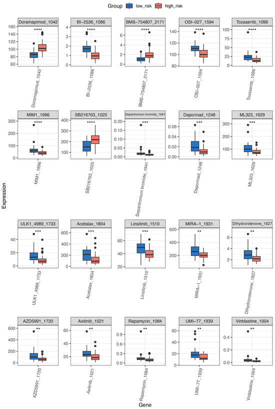 OncoPredict predicts drug sensitivity based on gene expression levels. Out of 198 chemotherapeutic agents analyzed, 75 showed a significant difference in the predicted IC50 values between the two groups (p < 0.05). We highlight the top 20 drugs with the lowest p-values (p < 0.001) in Figure 7. The higher-risk group exhibited lower predicted IC50 values for BI-2536, OSI-027, Sepantronium bromide, MIM1, Tozasertib, Daporinad, ML323, Acetalax, Linsitinib, and ULK_4989 and others, compared to the lower-risk group, suggesting greater drug sensitivity compared to the lower-risk group. Detailed drug sensitivity data are provided in Supplementary Table S12, and additional results are shown in Supplementary Figure S9.