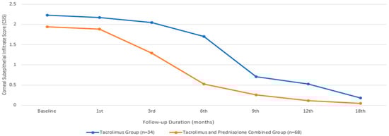 In terms of the CSIS, the baseline mean value for the group treated with only tacrolimus was 2.23 ± 1.09, while that for the group treated with both tacrolimus and prednisolone was 1.94 ± 0.91, with a comparable median value. There was no statistically significant difference between the two groups in terms of the baseline CSIS (p = 0.377). An initial statistically significant improvement in the CSIS was observed in the patients treated with tacrolimus alone at the beginning of the sixth month, compared to their baseline measurements (p = 0.014). However, in the group receiving combined prednisone and tacrolimus, this occurrence began during the third month (p ≤0.001). While the combined treatment group showed a significantly faster improvement in visual CSIS (Figure 2), there was no statistically significant difference between the two groups at the end of the 18th month (p = 0.187).