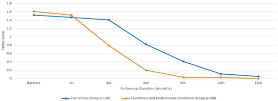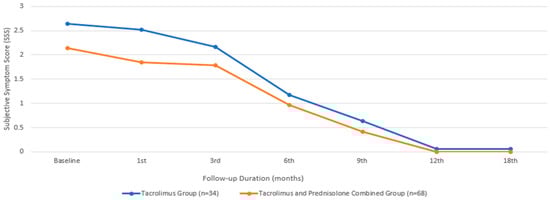In terms of SSS, the baseline mean value for the group treated with only tacrolimus was 2.64 ± 0.49, while that for the group treated with both tacrolimus and prednisolone was 2.14 ± 0.89, with a comparable median value. There was no statistically significant difference between the two groups in terms of the baseline SSS (p = 0.065). An initial statistically significant improvement in the SSS was observed in the patients treated with tacrolimus alone at the beginning of the third month, compared to their baseline measurements (p = 0.011). However, in the group that received combined prednisolone and tacrolimus, this occurrence began during the first month (p = 0.002). While the combined treatment group showed a significantly faster improvement in SSS (Figure 3), there was no statistically significant difference between the two groups at the end of the 18th month (p = 1.00).