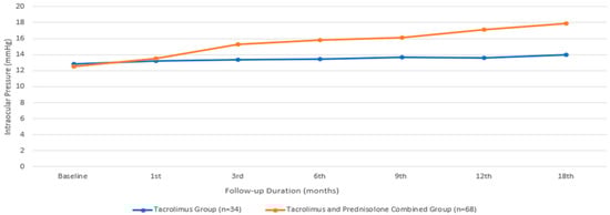 Regarding IOP, the median value for the group treated with only tacrolimus was 12.82 ± 1.77 mmHg, while that for the group treated with both tacrolimus and prednisolone had a comparable mean value of 12.5 ± 2.63 mmHg. There was no statistically significant difference between the two groups in terms of the baseline IOP (p = 0.371). There was no statistically significant difference in IOP among the individuals who received only tacrolimus during the therapy period (p = 0.609, according to the Friedman test). However, in the group receiving the combined treatment, IOP showed a statistically significant increase from the baseline in the third month (p = 0.001). The IOP of the group receiving combined treatment was still higher at the end of the 18th month compared to the group receiving only the tacrolimus treatment (p ≤ 0.001) (Figure 6). Four patients who underwent the combined treatment experienced an elevation in IOP that required treatment. Brimonidine eye drops (Alphagan; Allergan Inc., Irvine, CA, USA) were prescribed for twice-daily use. After brimonidine administration, the IOP values remained within normal limits.