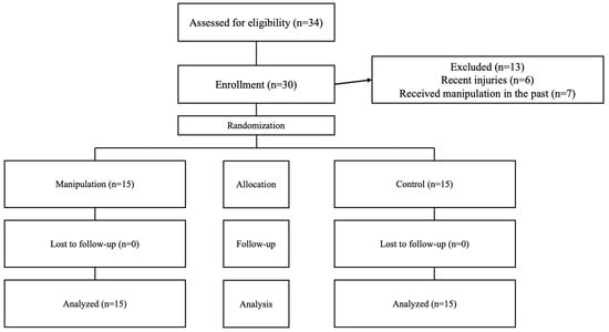 Of the 43 volunteers initially recruited, 6 were excluded due to lower limb injuries sustained in the previous six months, and 7 were excluded due to having received prior manipulation. After these exclusions, the remaining 30 participants were assigned to both groups and completed the intervention (Figure 1). All 30 participants were analyzed and included in the statistical evaluation.
