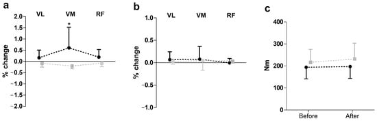 Impact of hip manipulation on surface electromyography (SEMG) and performance during knee extension. Black circles: hip manipulated group; gray squares: sham controlled group; VL: vastus lateralis; VM: vastus medialis; RF: rectus femoris. Percentage changes in surface electromyography amplitude (a), median frequency (b), and peak torque (c) * Significant difference with all other muscle in both groups except RF in hip-manipulated group at p ≤ 0.05.