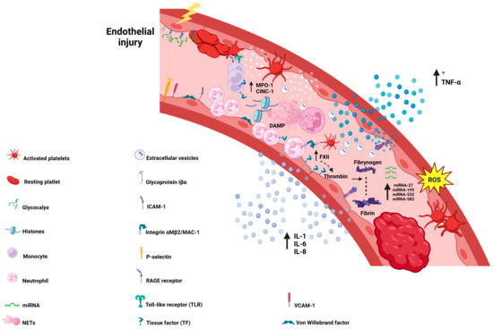 Inflammation and thrombosis are interconnected in a self-amplifying cycle, where inflammation triggers thrombus formation, and thrombosis, in turn, enhances inflammation through the activation of ECs and platelets [1,74]. Under physiological conditions, inflammation plays a critical role in defending against pathogens. However, a similar cascade of signals can be activated by endothelial injury in the absence of infectious agents, leading to sterile inflammation.
