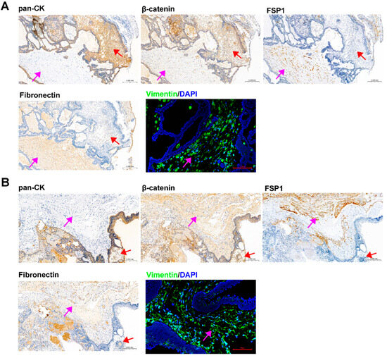 IHC and IF staining of serial slices of ACP tissue were performed to confirm the origin and tissue localization of primary cells. The staining results of 0913 and 0824 tissues were shown in Figure 3A,B, respectively. In 0913 tissue sections, pan-CK expression was displayed within the palisade-like epithelial cell layer, helical cell clusters, keratin nodules and stellate reticulum (marked with a red arrow), and were absent in the fibrous stroma area (marked with a pink arrow). Positive staining of β-catenin was observed in whole section, but the nuclear translocation was only presented in helical cell clusters. In contrast, strong and dispersive FSP1, Fibronectin and Vimentin expressions were only detected in the fibrous stroma area (marked with a pink arrow). A similar expression pattern was observed in the 0824 tissue sections. These staining results of primary cells (Figure 2) combined with parental tissues indicated that the isolated ACP primary cells with CAF features might be derived from the fibrous stroma of ACP.