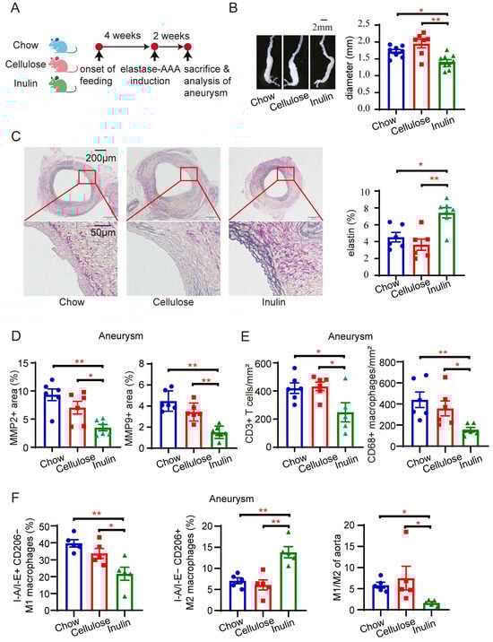 Inulin diet mitigates the progression of elastase-induced abdominal aortic aneurysms in mice. (A) Experimental design: SPF C57BL/6 mice were subjected to a 4-week administration of either chow diet, 15% cellulose diet, or 15% inulin diet before AAA induction through elastase injection. The mice were euthanized for assessment two weeks after AAA induction. (B) Illustration of aneurysms with representative images and statistical analysis of maximum external diameters from mice on different diets (n = 7–10). (C) Representative EVG staining images of aneurysms and quantification of the percentage of elastin area to total aortic area from mice administered different diets (n = 6–7). (D) Summary data of immunohistochemical (IHC) staining of the aneurysms, indicating the percentage of MMP2 and MMP9 positive area to the total aortic area (n = 5–7). (E) Summary data of IHC staining of the aneurysms showing the number of CD3+ T cells and CD68+ macrophages per mm2 of the aorta (n = 5–7). (F) Summary flow cytometry data illustrating the percentage of I-A/I-E+ CD206− M1 macrophages, the percentage of I-A/I-E− CD206+ M2 macrophages, and the ratio of M1/M2 macrophages in aneurysms (n = 5). * p < 0.05, ** p < 0.01, one-way ANOVA followed by Tukey’s multiple comparisons test or Kruskal–Wallis followed by Dunnett’s multiple comparisons test. Scale bars are depicted as indicated in the images. Each dot represents the mean value of 4−8 consecutive sections of an individual mouse in (C–E).