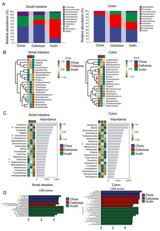 PCoA, utilizing weighted Unifrac distances and Bray–Curtis distances, were employed to evaluate β diversity among distinct groups at the genus level. The results revealed that microbiota profiles in both the small intestine and colon underwent alterations with both inulin and cellulose diets (Figure 2B, Supplementary Figure S6). Notably, regardless of the dietary type, microbiota profiles in the small intestine exhibited distinctions from those in the colon (Supplementary Figure S7).