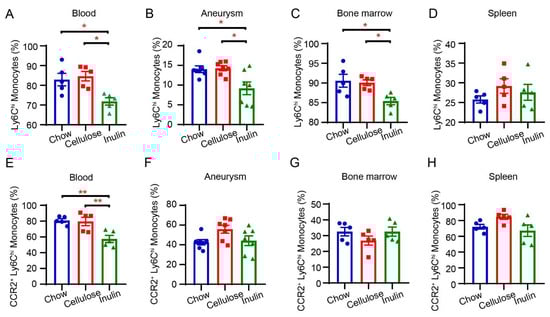 Inulin diet decreases Ly6Chi monocytes in bone marrow, peripheral blood, and aneurysms. The percentages of Ly6Chi monocytes (of Ly6G- CD11b+ monocytes) in the blood (A), aneurysm (B), bone marrow (C), and spleen (D) were measured by flow cytometry (n = 5–7). The percentages of CCR2+ Ly6Chi monocytes (of Ly6Chi monocytes) in the blood (E), aneurysm (F), bone marrow (G), and spleen (H) were measured by flow cytometry (n = 5–7). * p < 0.05, ** p < 0.01. One-way ANOVA followed by Tukey’s or Dunnett’s multiple comparisons test.
