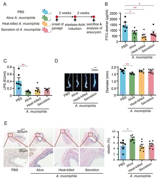 To evaluate the influence of A. muciniphila on AAA-associated intestinal barrier dysfunction, we administered A. muciniphila to AAA mice via oral gavage (Figure 6A). The results showed that the AAA mice with an administration of live A. muciniphila exhibited reduced plasma FITC fluorescence intensity, systemic LPS levels, aneurysm diameter, and elastin degradation (Figure 6B–E). Conversely, treatment with heat-killed A. muciniphila and A. muciniphila secretions did not impact aneurysm diameter, elastin degradation, or circulating endotoxin levels in AAA mice, despite demonstrating improvements in intestinal permeability (Figure 6B–E).