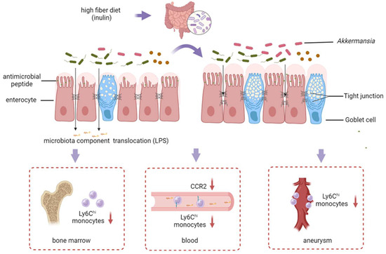 A substantial accumulation of macrophages occurs within aneurysm walls, predominantly derived from circulating monocytes. Pro-inflammatory Ly6Chi monocytes play a more pivotal role in the progression of AAA compared with Ly6Clow monocytes [34]. Notably, our findings indicate that the inulin diet serves as a preventive measure against increased intestinal permeability. This protective effect can, in turn, hinder the generation of Ly6Chi monocytes in the bone marrow, subsequently inhibiting the migration of Ly6Chi monocytes into the aneurysm and contributing to the mitigation of AAA progression.