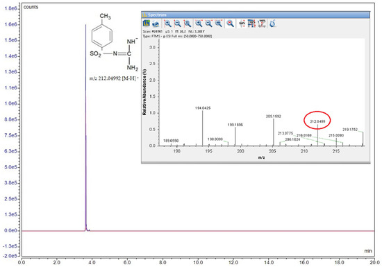 The sulfonamide derivative synthesis was structurally confirmed by the HRMS method, and the corresponding spectrum is presented in Figure 2. The compound was diluted in methanol (100 ng/mL) and then directly analyzed by the mass detector. Detection was carried out in negative ionization mode, with the selected ion having a mass of m/z 212.04992 [M-H]⁻.