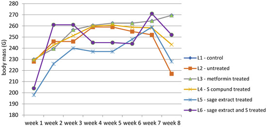 The body weight of all groups was measured according to the experimental protocol. The evolution of body weight across the eight-week experimental period for all six groups is illustrated in Figure 4, with detailed weekly values provided in Table S2 (Supplementary Materials).