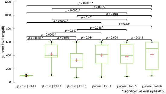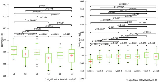 Data distribution was assessed using multiple normality tests, including Shapiro-Wilk. Results indicated that body weight data were normally distributed for groups L1 to L5 (p-values from 0.240 to 0.579), whereas group L6 significantly deviated from normality (p = 0.016). While Levene’s test indicated homogeneous variances for most weeks, heteroscedasticity was observed during weeks 2 and 3 (p < 0.05). According to these findings, further statistical comparisons of body weight between groups and between weeks of study were performed using non-parametric methods Kruskal-Wallis test followed by Dunn’s post-hoc comparisons (Figure 5).