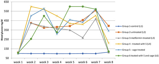 - Group 5 (L5)—Diabetes-induced, treated with sage extract (150 mg/kg b.w./day)