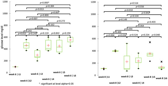 The evolution of body weight across the eight-week experimental period highlights distinct patterns among the experimental groups (Table S2). The control group (L1) exhibited a consistent and gradual increase in body weight, from a median of 230 g in week 1 to 269.5 g in week 8. In contrast, the diabetes-induced untreated group (L2) followed a similar pattern up to week 3 but exhibited marked weight loss following diabetes onset, reaching a minimum of 217 g by week 8. The metformin-treated group (L3) followed a similar trend with L1, with stable median weights from week 4 onward (260.5 g to 269.5 g). The group receiving the synthetic compound (L4) showed initial stabilization, but following treatment onset, body weight gradually decreased (from 259 g to 243.25 g), with no recovery trend. Subjects treated with sage extract alone (L5) experienced moderate improvement, showing more stable weight than untreated animals, but did not reach the levels observed in either the control or metformin groups. Finally, the group receiving combined treatment (L6: sage extract + compound) showed a substantial increase in body weight after the treatment unset with a slight weight decrease (from 261 g to 252 g), in week 8.