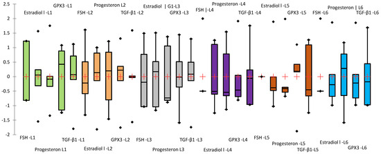 Notable, the group treated with sage + synthetic compound (L6) exhibited a significant positive correlation between GPX3 and FSH (r = 0.929, p = 0.023), which may indicate an indirect effect of the treatment on hormonal regulation through mechanisms related to oxidative stress. The active compounds of the sage extract, particularly salvianolic acids, activate AMPK signaling, improve mitochondrial function, and reduce oxidative damage [52]. In contrast, the group treated only with sage (L5) did not show significant correlations between the analyzed biomarkers.