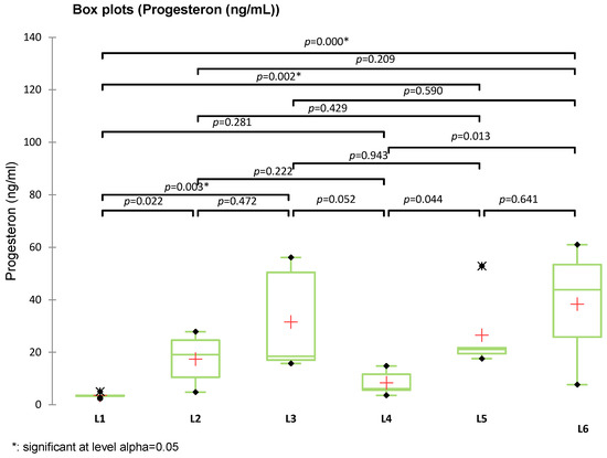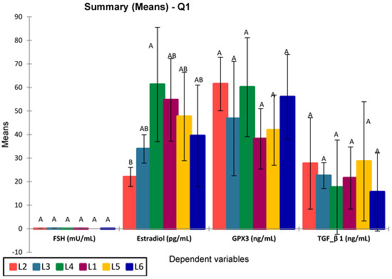 For FSH, even though ANOVA did not show significant differences (p = 0.075) between the groups. Dunnett’s test showed significant differences in group 3 (0 = 0.030).