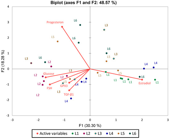 Metformin treatment (L3) appeared to have a specific effect on FSH regulation, as in this group, blood glucose correlated negatively with FSH (r = −0.904, p = 0.035).