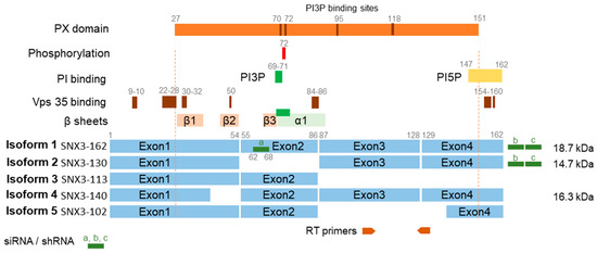 - Xu, Y.; Hortsman, H.; Seet, L.; Wong, S.H.; Hong, W. SNX3 Regulates Endosomal Function through Its PX-Domain-Mediated Interaction with Ptdlns(3)P. Nat. Cell Biol. 2001, 3, 658–666. [Google Scholar] [CrossRef]