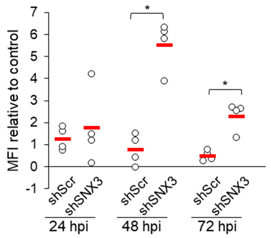 3.5. SNX3 Contributes to a Mechanism That Controls Virion Assembly and Egress