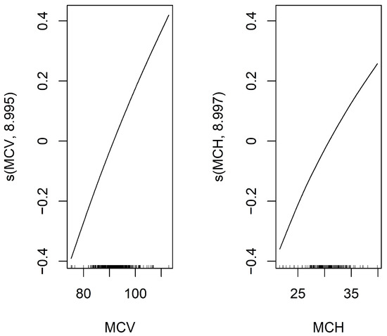 Smooth functions of MCV and MCH on mSLI in the Generalized Additive Model (GAM). This figure displays the smooth functions of MCV and MCH from a GAM with a smoothing spline using 9 degrees of freedom. The Y-axis shows the estimated effect of MCV and MCH on the response variable, mSLI, after adjusting for other covariates. The black line represents the fitted smooth function, illustrating how MCV and MCH influence mSLI.