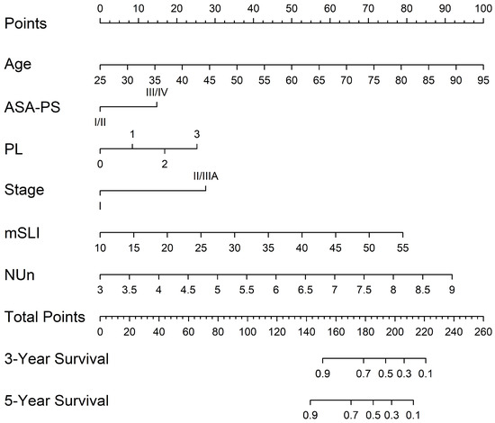 Nomogram constructed from the mSLI model for predicting 3- and 5-year overall survival. The nomogram illustrates the predicted probability of overall survival using the mSLI model, which incorporates age, ASA-PS, pleural invasion (PL), TNM stage, mSLI, and NUn score.