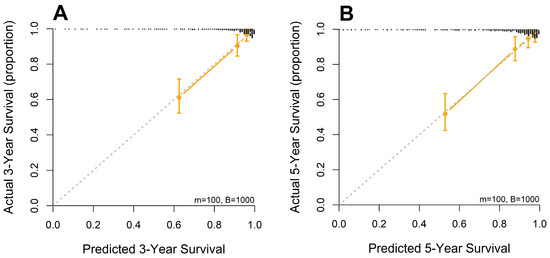 Calibration curves for 3-year (A) and 5-year (B) overall survival predicted by the mSLI model. The mSLI model incorporates age, ASA-PS, pleural invasion, TNM stage, mSLI, and NUn score. The data points for error bar (m) and number of bootstrapping (B) are demonstrated in the figure legend.
