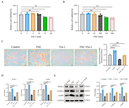 (A) Effects of exposure to different concentrations of Fer-1 (0, 1, 5, 10, 15, or 20 μM) on MSC viability. (B) Effects of exposure to different concentrations of ferric ammonium citrate (FAC) (0, 10, 50, 100, 150, or 200 μM) on MSC viability. (C) ORO staining and quantitative analysis of MSC adipogenic differentiation. The scale bar in the images represents 50 μm. (D) qRT-PCR and (E) Western blotting analysis of the expression of the adipogenic markers PPAR-γ, C/EBP-α, and FABP4 in MSCs. All the data are presented as the means ± SDs, with n = 3 per group, * p < 0.05, ** p < 0.01, and *** p < 0.001. ns, no significant difference. All experiments were independently repeated three times.
