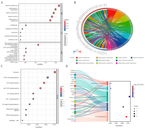 To comprehensively assess the biological functions of FRDEGs, we first performed Gene Ontology (GO) and Kyoto Encyclopedia of Genes and Genomes (KEGG) enrichment analyses. GO functional analysis revealed that these genes are involved primarily in biological processes such as the response to oxidative stress and the cellular response to chemical stress. These genes are associated with cellular components such as the autophagosome membrane and secondary lysosomes, and they regulate molecular functions, including ferric iron binding, NAD+ ADP-ribosyltransferase activity, and NAD+-protein ADP-ribosyltransferase activity. The enrichment results are presented in a bubble plot (Figure 3A). The top 10 biological processes (BPs) were used to generate a chord diagram (Figure 3B).