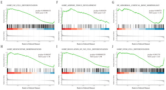 KEGG pathway enrichment analysis revealed that the FRDEGs are involved in multiple signaling pathways related to MSC adipogenic differentiation, including the FoxO, PPAR, adipocytokine, JAK-STAT, and PI3K-Akt signaling pathways (Figure 3C). Additionally, we constructed a Sankey diagram to visualize the relationships between the enriched genes and key KEGG pathways (Figure 3D). Furthermore, gene set enrichment analysis (GSEA) revealed significant enrichment of the DEGs identified from the GSE59450 dataset in pathways related to fat cell differentiation, adipose tissue development, abnormal cortical bone morphology, mesenchyme morphogenesis, the regulation of fat cell differentiation, and stem cell differentiation (Figure 3E–J).