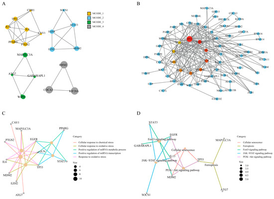 (A) The MCODE algorithm revealed four gene clusters. (B) The Betweenness (BC) algorithm of the CytoNCA plugin was used to construct a PPI network consisting of 118 genes, and the size and color depth of the circles indicate the score. The top 10 hub genes, identified by intersection using the MCODE algorithm, are marked in red. (C,D) GO enrichment analysis and KEGG pathway analysis of ferroptosis-related hub genes.