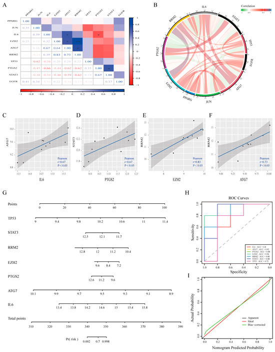 (A) Correlation heatmap of ferroptosis-associated hub genes. (B) Correlation chord diagram of ferroptosis-associated hub genes. (C–F) Scatter plots depicting the four most strongly correlated FRHG pairs. (G) Construction of the nomogram model based on the selected FRHGs. (H) ROC curve and the area under the curve (AUC). (I) Calibration curve illustrating the diagnostic ability of the nomogram model. * p < 0.05, ** p < 0.01.