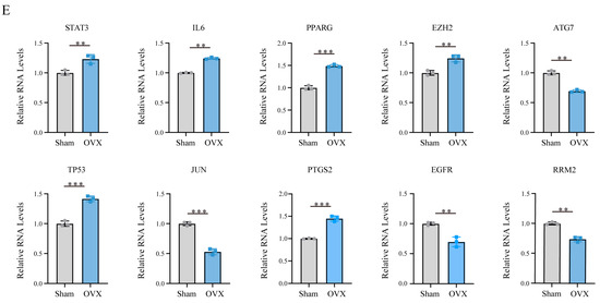We subsequently performed qRT-PCR to assess the expression levels of these 10 hub genes. Compared with the sham group, the OVX group presented significant downregulation of ATG7, JUN, EGFR, and RRM2 and significant upregulation of TP53, PPARG, EZH2, IL6, PTGS2, and STAT3 (p < 0.05) (Figure 6E). These results suggest that our bioinformatics data mining approach was highly reliable.