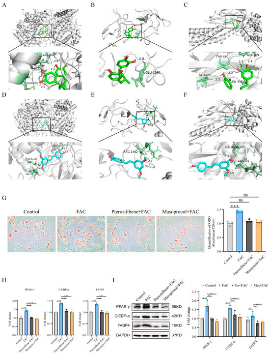 Molecular docking analysis and functional validation of the candidate drugs. (A) Molecular docking between masoprocol and PTGS2. (B) Molecular docking between masoprocol and TP53. (C) Molecular docking between masoprocol and STAT3. (D) Molecular docking between pterostilbene and PTGS2. (E) Molecular docking between pterostilbene and TP53. (F) Molecular docking between pterostilbene and STAT3. (G) ORO staining and quantitative analysis of MSC adipogenic differentiation. The scale bars in the images represent 50 μm. (H) qRT-PCR and (I) Western blotting analysis of the expression of the adipogenic markers PPAR-γ, C/EBP-α, and FABP4 in MSCs. All the data are presented as the means ± SDs, with n = 3 per group, ** p < 0.01, and *** p < 0.001. ns, no significant difference. All experiments were independently repeated three times.
