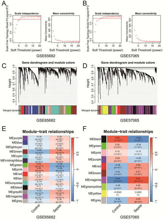 (A,B) The selection of soft-thresholding powers for GSE65682 (A) and GSE57065 (B). The selected powers (7 for (A), 6 for (B)) ensured scale-free topology with sufficient mean connectivity. (C,D) Gene clustering dendrograms and module assignments for GSE65682 (C) and GSE57065 (D). Modules are represented by distinct colors, and similar modules were merged on the basis of eigengene similarity. (E,F) Heatmaps of module–trait correlations for GSE65682 (E) and GSE57065 (F). Each cell shows the Pearson correlation coefficient and p-value.