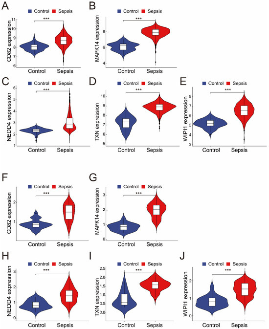 (A–E) The expression of the five intersecting genes (CD82, MAPK14, NEDD4, TXN, and WIPI1) in the merged dataset (GSE57065 and GSE65682). Violin plots revealed significantly greater expression levels in the sepsis group than in the control group (*** p < 0.001). (F–J) Validation of the five genes in the independent dataset (GSE26378). Like in the merged dataset, all five genes (CD82, MAPK14, NEDD4, TXN, and WIPI1) were significantly upregulated in the sepsis group (*** p < 0.001).