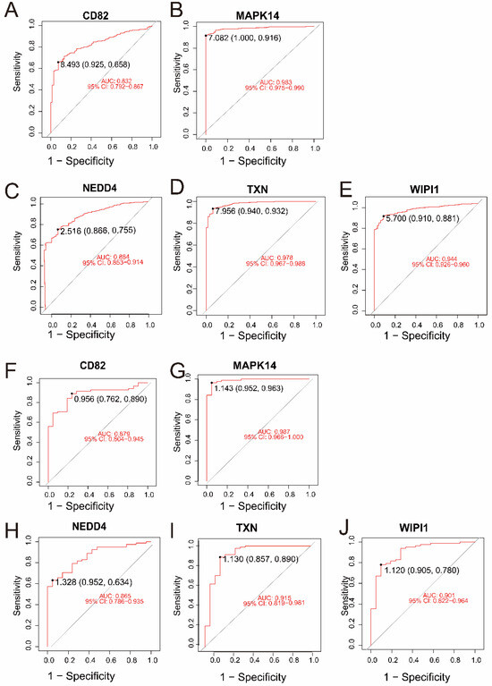 (A–E) ROC curves for the five intersecting genes (CD82, MAPK14, NEDD4, TXN, and WIPI1) in the merged dataset (GSE57065 and GSE65682). The AUC values and 95% confidence intervals indicate excellent diagnostic accuracy for all genes. (F–J) ROC curves for the same five genes in the validation dataset (GSE26378). Similar to the merged dataset, all genes exhibited high diagnostic performance, with MAPK14 and TXN achieving the highest AUC values.