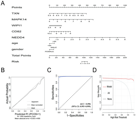 (A) Nomogram for the diagnostic prediction model. The contribution of each gene (TXN, MAPK14, WIPI1, CD82, and NEDD4) and clinical information are represented, and the total points correspond to the predicted risk of sepsis. (B) Calibration curve for the prediction model. The apparent line (dotted) and bias-corrected line (solid) show the agreement between the predicted probabilities and actual outcomes. The ideal line represents perfect calibration. (C) Receiver operating characteristic (ROC) curve for the prediction model. The AUC value of 0.996 demonstrates excellent discriminative performance. (D) Decision curve analysis (DCA) showing the net benefit of the prediction model across different high-risk thresholds. The red line (model) outperforms the “all” (gray) and “none” (black) strategies, highlighting the model’s clinical utility.