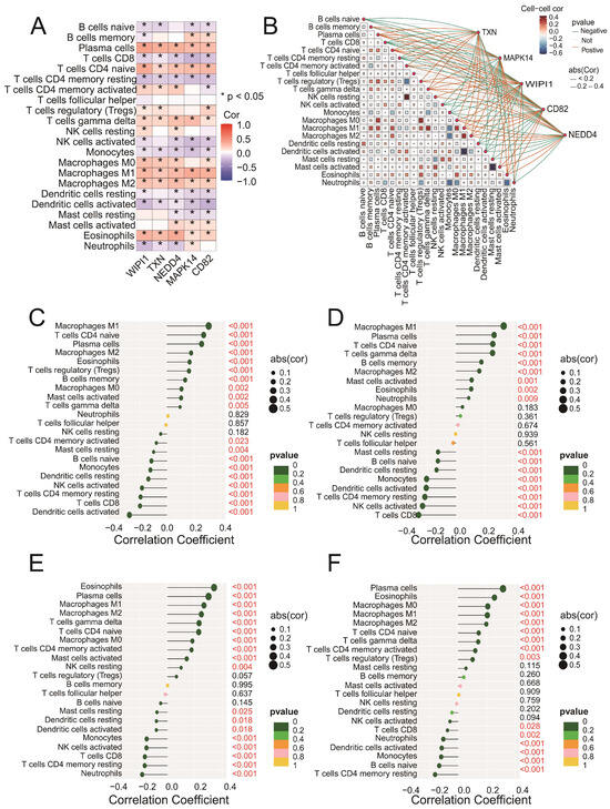 (A) A heatmap showing the Spearman correlation coefficients between the expression levels of the five intersecting genes (CD82, MAPK14, NEDD4, TXN, and WIPI1) and immune cell fractions. Positive correlations are indicated in blue, negative correlations are in red, and statistically significant correlations are marked with asterisks (* p < 0.05). (B) A network plot illustrating the interactions between immune cells and the five intersecting genes. The blue edges represent positive correlations, whereas the red edges indicate negative correlations. The edge thickness reflects the strength of the correlation. (C–F) Lollipop plots illustrating the correlation coefficients between CD82 (C), MAPK14 (D), NEDD4 (E), and TXN (F) and immune cell fractions derived from the CIBERSORT analysis. The x-axis represents the correlation coefficients, whereas the y-axis represents the immune cell types. Each dot represents the strength of the correlation for a specific immune cell type, with the corresponding bars extending to the x-axis.