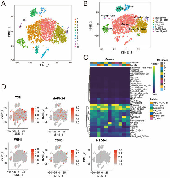 (A,B) t-SNE plots illustrating cell clustering (A) and cell type annotation on the basis of canonical markers (B). The colors represent distinct clusters, and the labels indicate the cell types. (C) Heatmap showing the distribution of cell clusters and their associated cell types identified through single-cell RNA sequencing analysis. The color intensity represents the score of each cluster corresponding to specific cell types, including NK cells, B cells, monocyte cells, and others. (D) t-SNE plots displaying the expression patterns of CD82, MAPK14, NEDD4, TXN, and WIPI1. Red indicates increased expression, and gray indicates decreased expression.
