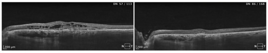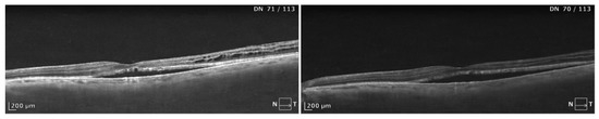 We did not find a correlation between basic SD-OCT measurements and the response to PDT. However, some studies have reported greater improvements in patients with a thicker outer nuclear layer and an intact external limiting membrane, ellipsoid zone, and interdigitation zone [38,43,44,45,46]. These factors were not examined in our study, as we believe that they are difficult to evaluate in the presence of retinal edema, which can bias and distort measurements.