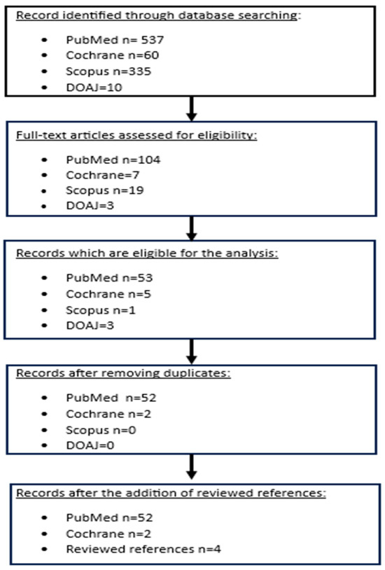 Taking into consideration the significant amount of heterogeneity that was present in the study designs, the methodology, the population, and the interventions among the included studies, we chose not to perform a quantitative synthesis of the study results. Thus, a narrative synthesis of the findings was followed. Table 1 and Table 2 show a summary of the data search and the search algorithm.