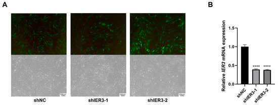 Lentiviral transfection of hMSCs for IER3 knockdown. (A) Cell morphology and GFP-positive expression under an inverted microscope and fluorescence microscope at 72 h after hMSCs transfection. (B) Efficiency of IER3 knockdown in lentiviral-transfected hMSCs (n = 3). Results were normalized to GAPDH expression. **** p < 0.0001. Scale bar, 100 μm.